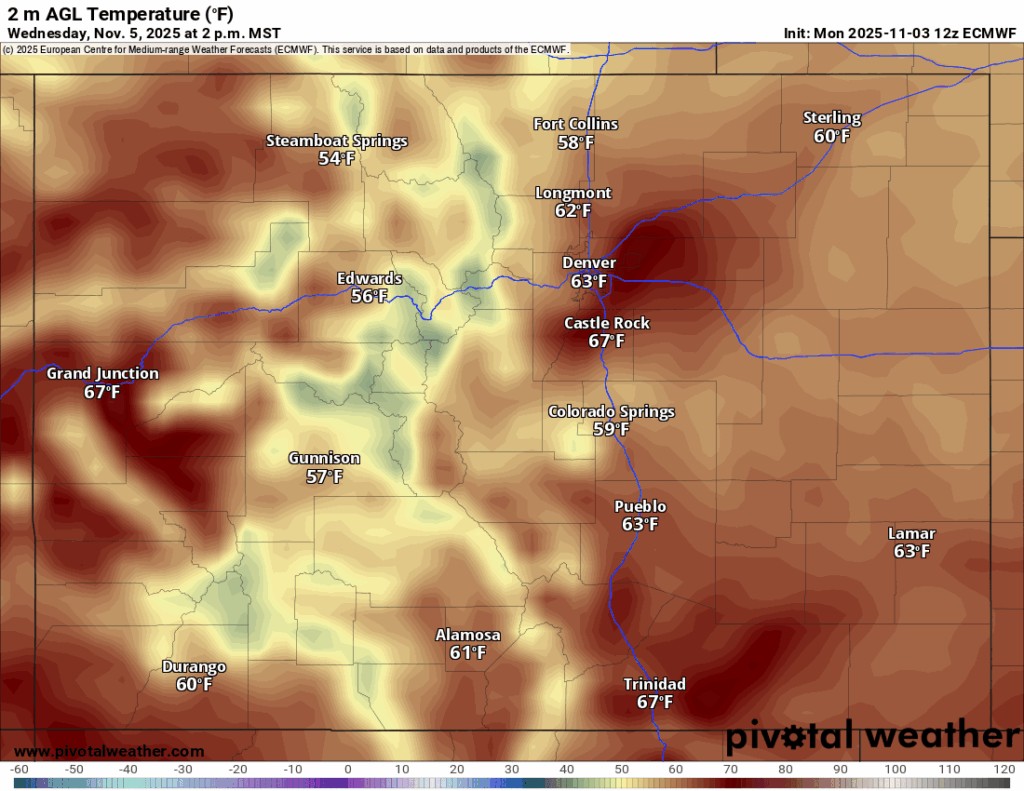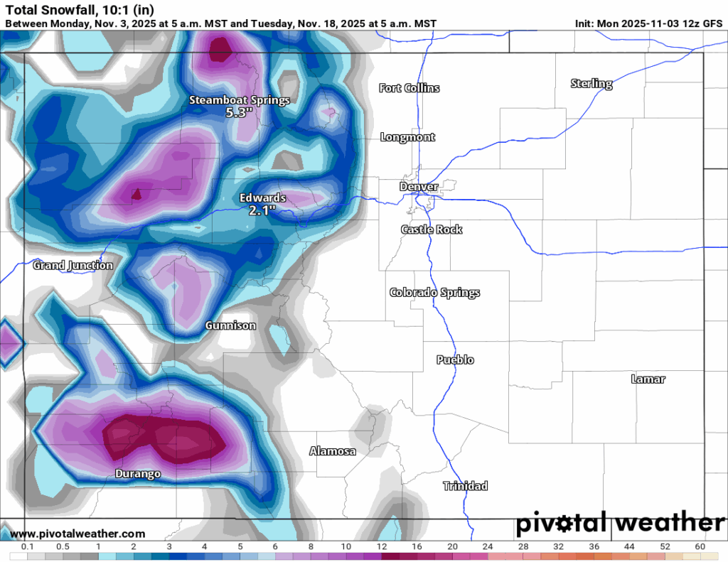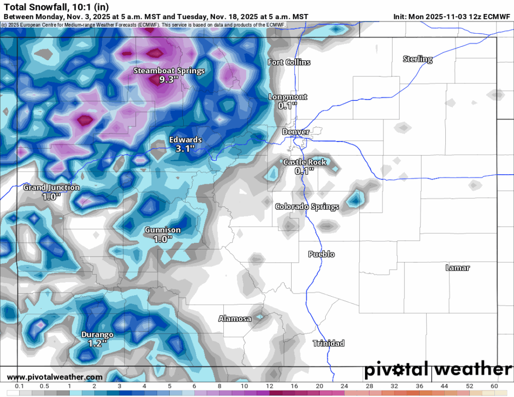 Mulai Kamis dini hari, model ECMWF dan GFS memperkirakan gelombang gangguan menyapu bagian utara Colorado, yang akan membawa salju ke utara Interstate 70, hingga Jumat larut pagi.